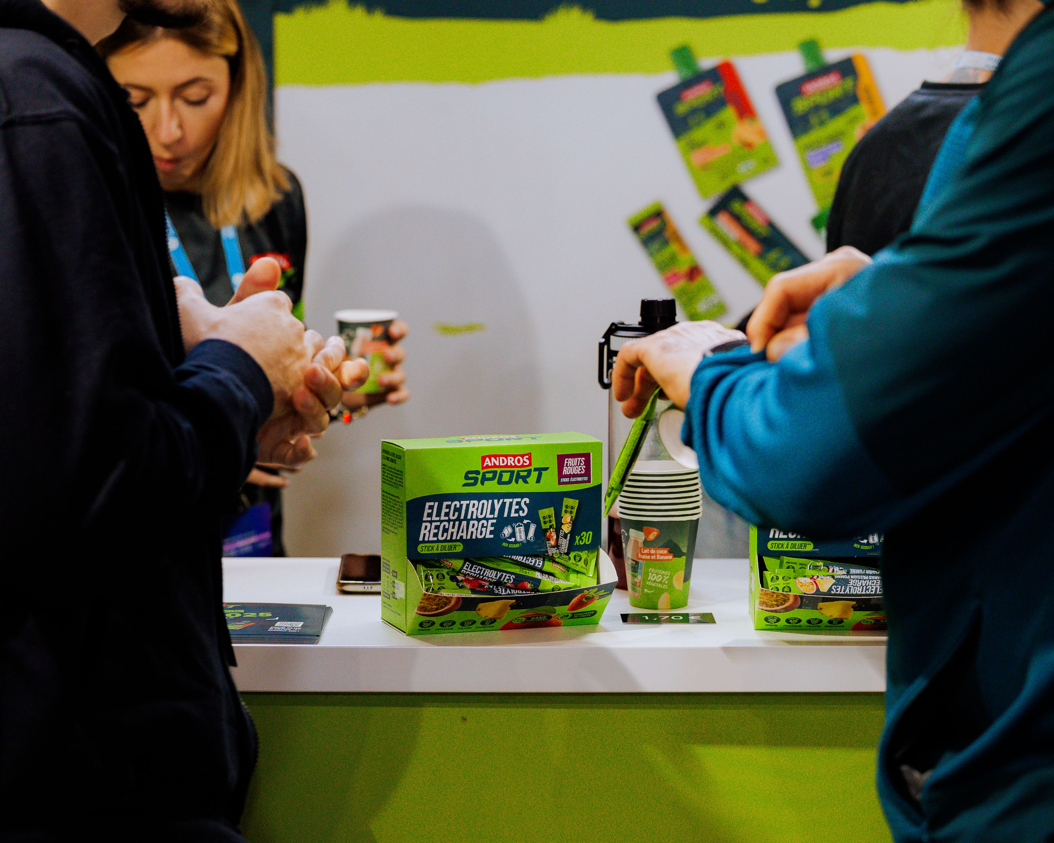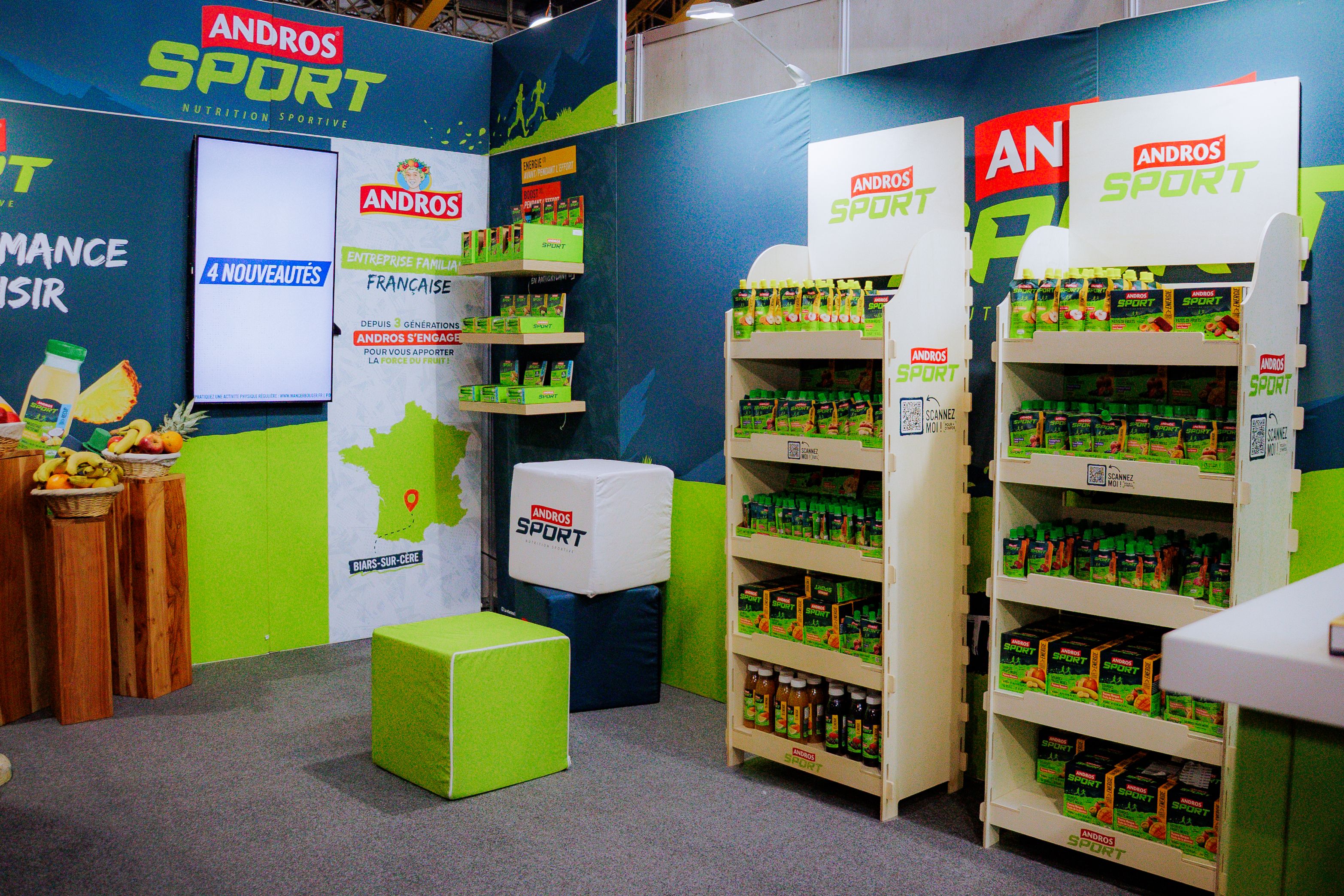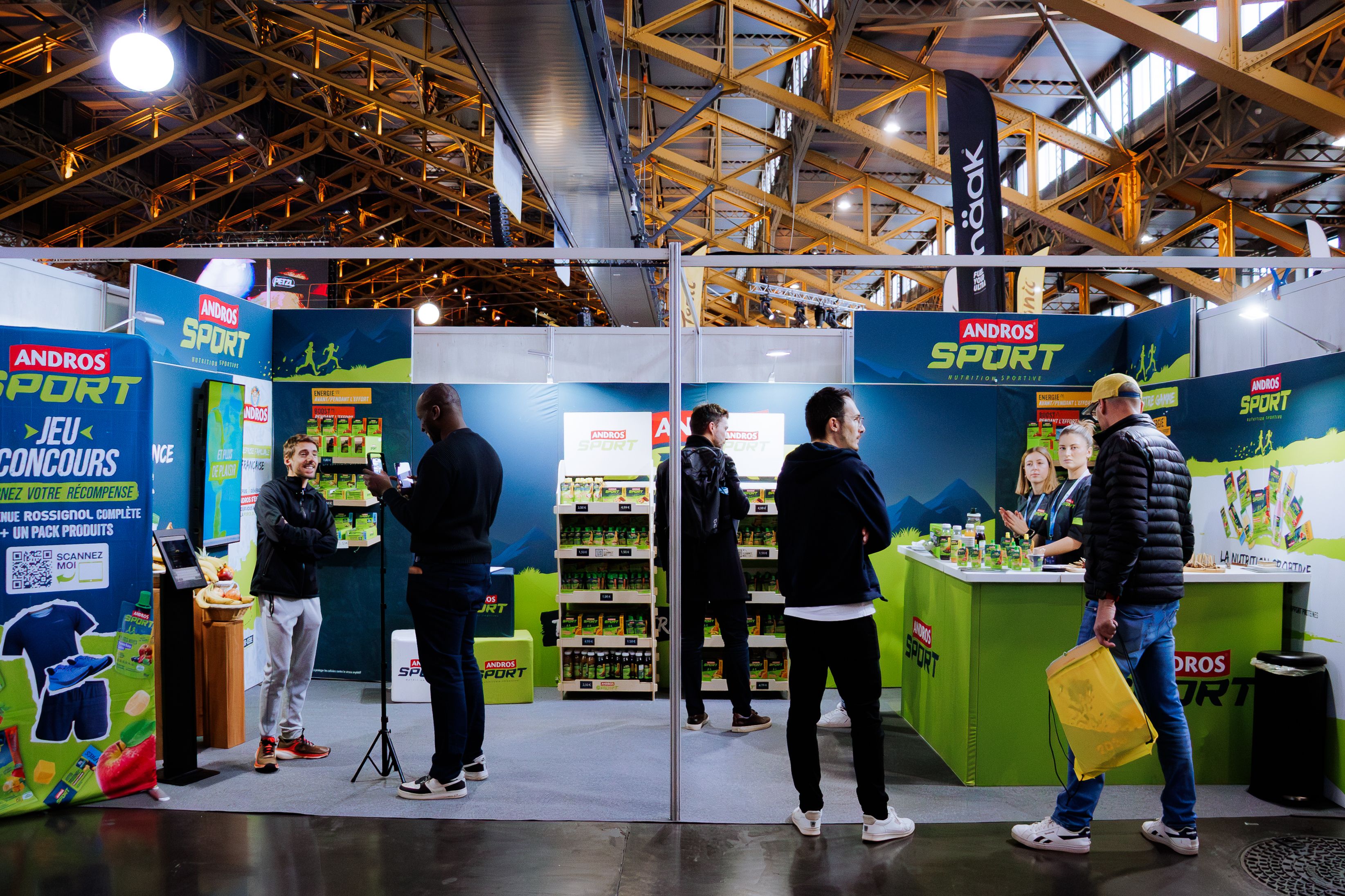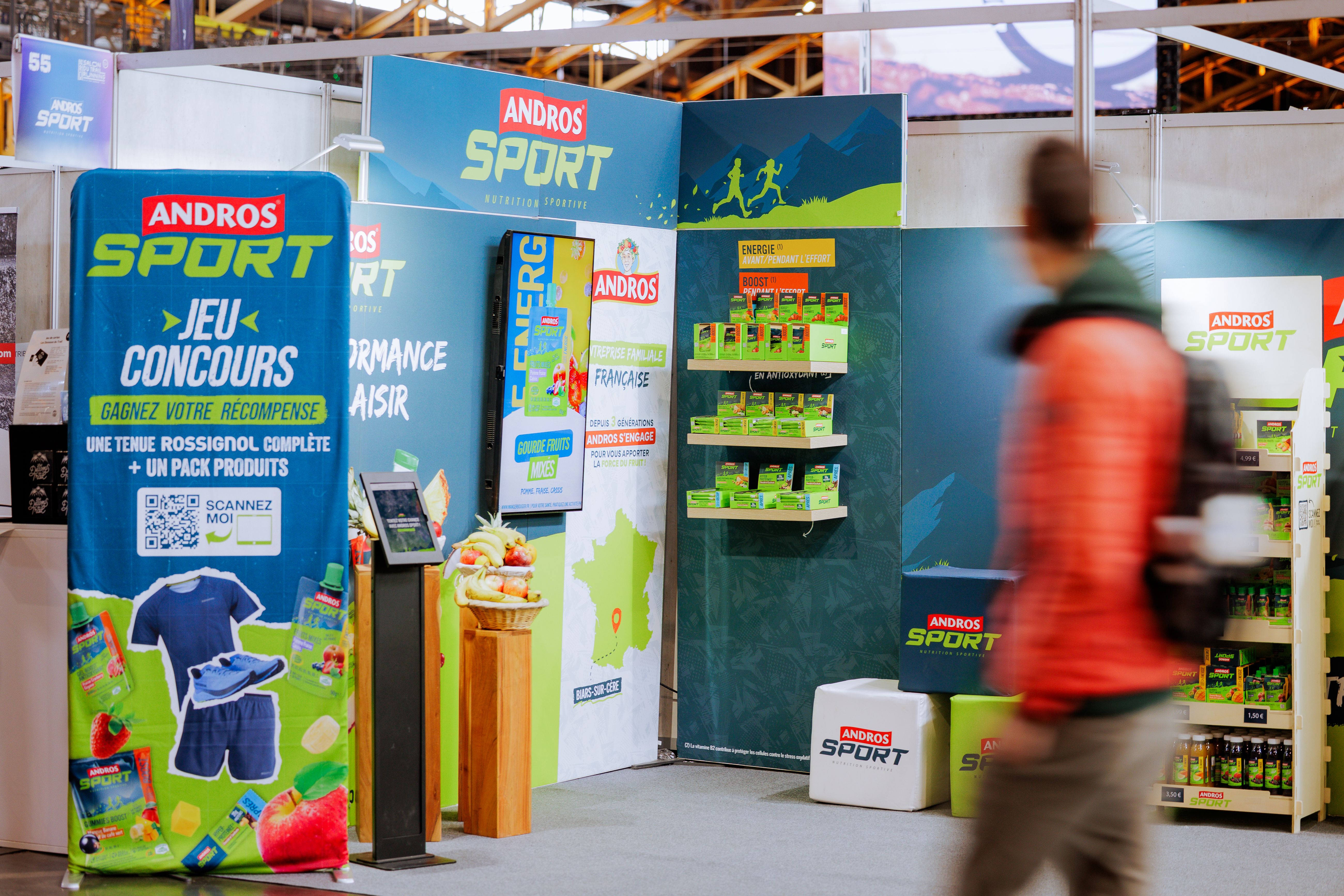 👍LES RÉSULTATS : La mission pour l'agence : la conceptualisation, le design du stand, le déploiement opérationnel, et l'exploitation de l'espace pendant 3 jours. Un espace de marque de 18m2 centré sur le testing produit et la gamification de l'expérience. La présentation sur du mobilier spécifique de la gamme de produits de nutrition sportive (une gamme complète pour une consommation avant, pendant et après une séance de sport).